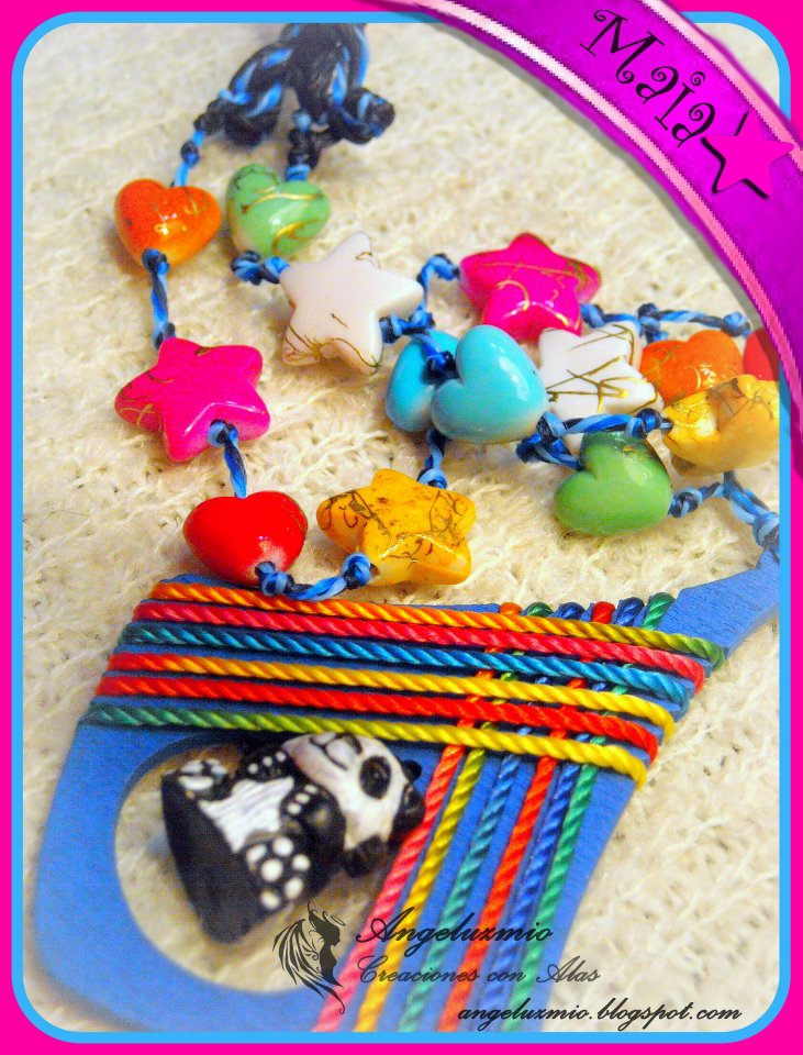Colgante realizado con importante pieza de madera adornada con hilos de seda y pieza de cerámica. Sujeta con hilo encerado elaborado, y cuentas acrílicas.